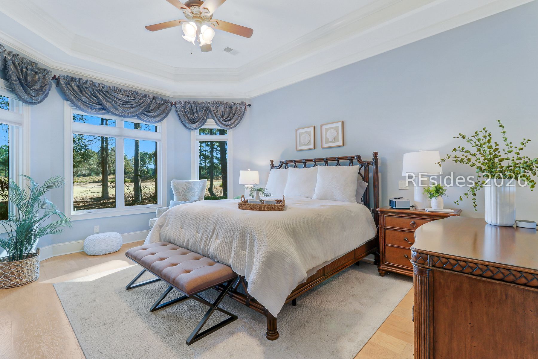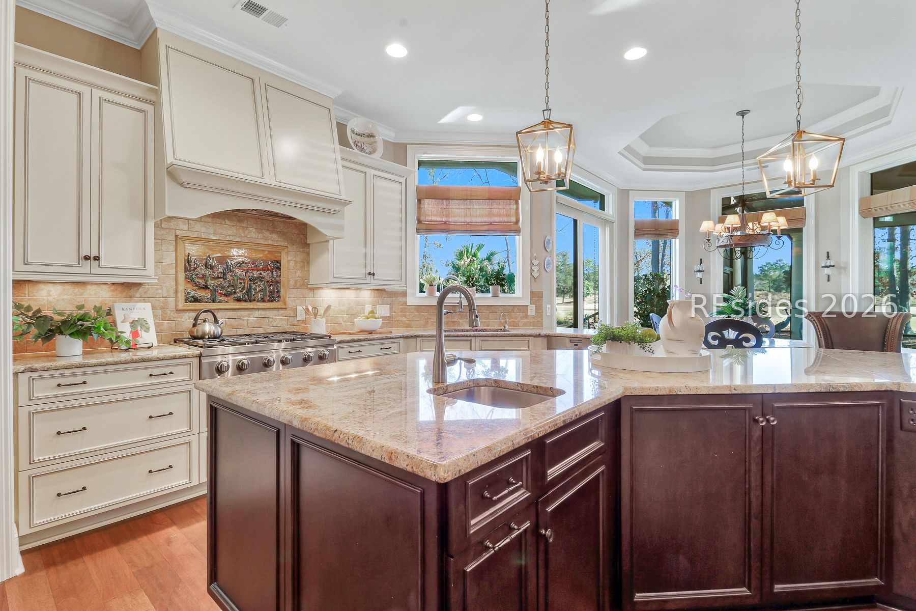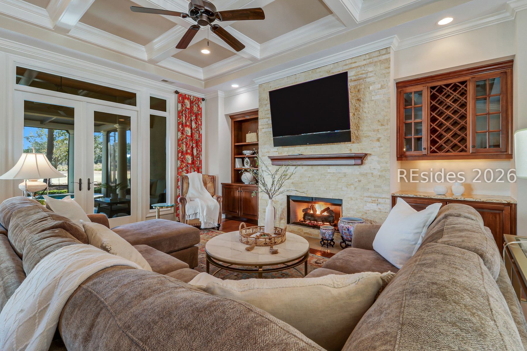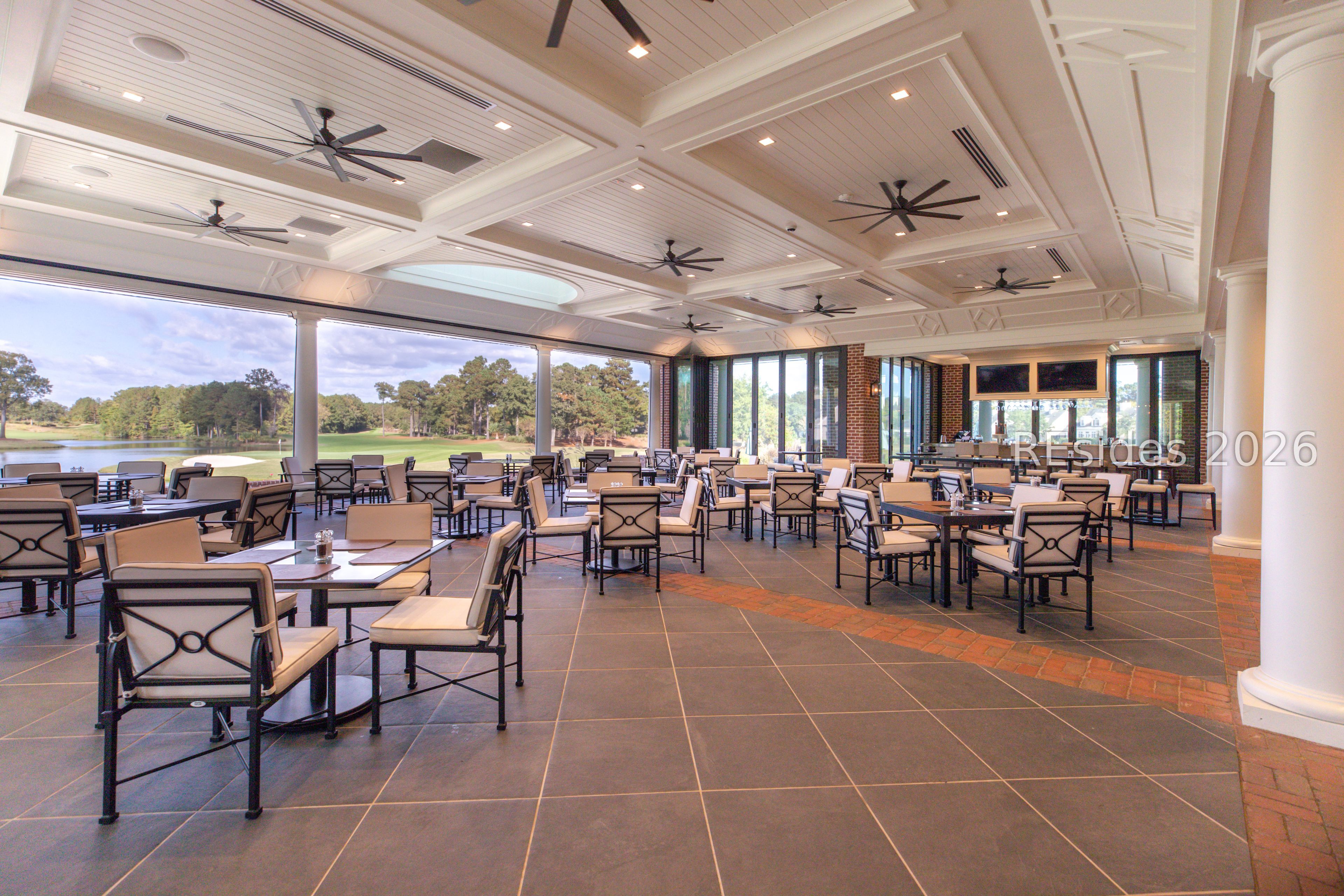 Boasting expansive golf views of the famed North Course at Berkeley Hall, this custom residence built by McNair delivers timeless Lowcountry design paired with meaningful modern upgrades. Fresh interior paint, new designer lighting, rich wood flooring, and an updated high-end kitchen with new appliances create a warm, move-in-ready atmosphere centered around the home's spacious gathering areas. Coffered ceilings frame the Great Room, which flows seamlessly to the expanded lanai, where a saltwater heated pool and spa overlook the pristine fairways-perfect for effortless indoor-outdoor living. The 3,672 square feet of heated living space includes a gracious first floor Primary suite, private office with rich mahogany cabinetry and built-ins, and private guest accommodations, while an additional 600 square feet of enclosed outdoor living enhances year-round enjoyment. An ideal property for visiting guests with a separate bonus room over the garage, complete with a full bath, and a second floor with a private guest suite, a loft area with a wet bar, and an enclosed balcony overlooking the links. Practical improvements include a new roof in '23, new washer and dryer, central vacuum, Hot Water Recirculation system, lanai resurfaced, walk-in storage with spray foam insulation, and a 2.5-car garage with epoxy flooring, EV charging capabilities, and built-ins. A refined, turnkey offering within one of the Top Platinum Clubs in the US- Berkeley Hall.